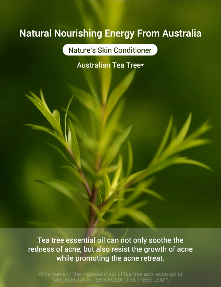 Австралийское чайное дерево *Кондиционер для кожи природыЭфирное масло чайного дерева может не только успокоить покраснение акне, но и противостоять росту акне, способствуя при этом отступлению акне.* Название в списке ингредиентов чайного дерева анти-гель от угрей "MELALEUCA ALTERNIFOLIA (чайное дерево) лист".