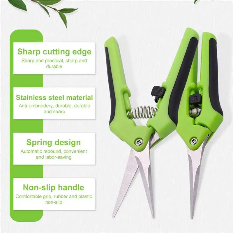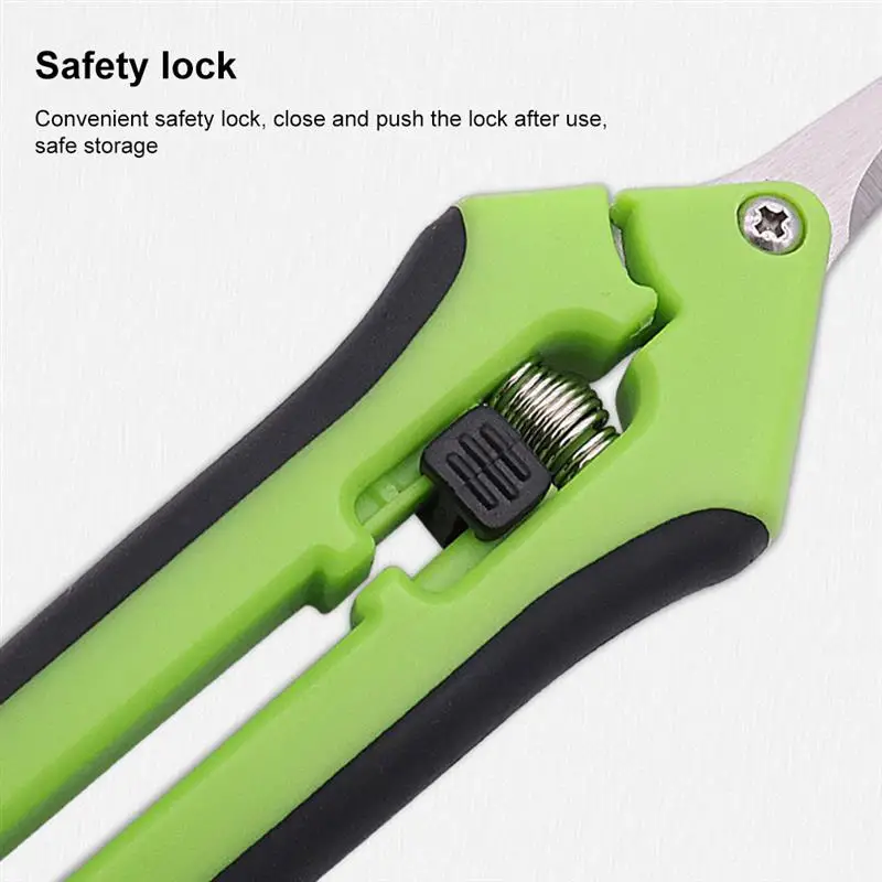 Точки пули: 1. Простота использования: Острые Ножницы, пружинная конструкция, удобная и трудозатратная, нескользящая ручка, удобный захват. 2. Пружинная конструкция: благодаря пружинной конструкции лезвие аккуратно открывается после каждого разреза и автоматически отскакивает, уменьшая усталость рук. 3. Материал: изготовлен из высококачественной нержавеющей стали, устойчив к коррозии, прочный, полностью закаленный, прецизионно заземленные лезвия из нержавеющей стали могут оставаться острыми даже после продолжительного использования. 4. Предохранительный замок: удобный предохранительный замок, закройте и нажмите после использования для безопасного хранения. 5. Использование: сбор фруктов и овощей, обрезка фруктов, обрезка в горшках и т. д.