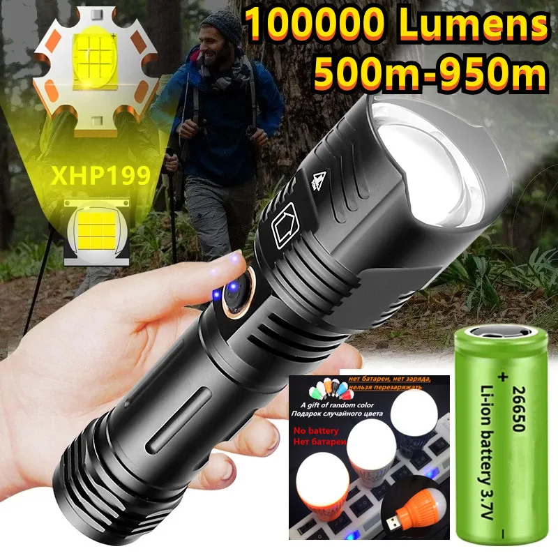 Новейший сверхъяркий светодиодный фонарик XHP199 с 9 ядрами, водонепроницаемый тактический фонарик с питанием от батареи 6000 мАч, фонарик XHP70