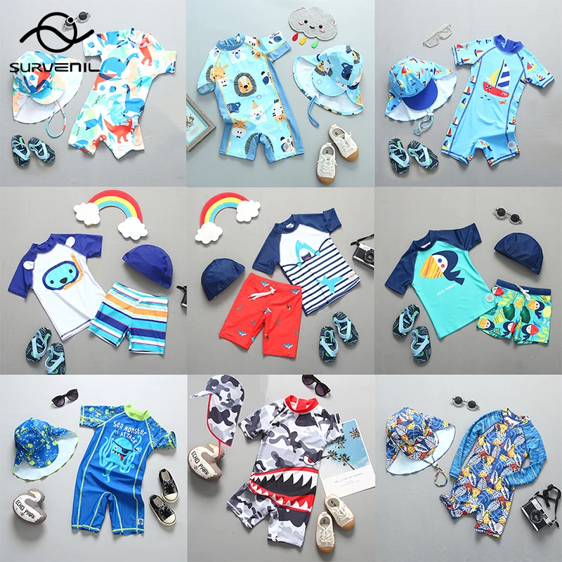 Слитный купальник с шапочкой UPF50, для мальчиков, с мультяшным при...