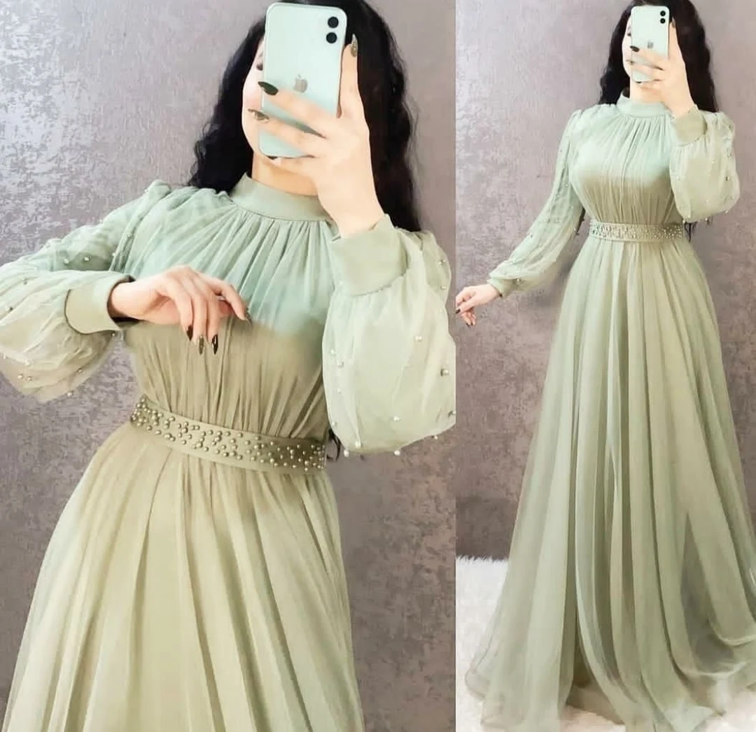 Винтажные мусульманские Вечерние платья а-силуэта с длинным рукавом, бусинами, высоким воротником, молнией на спине, тюлевые платья для женщин