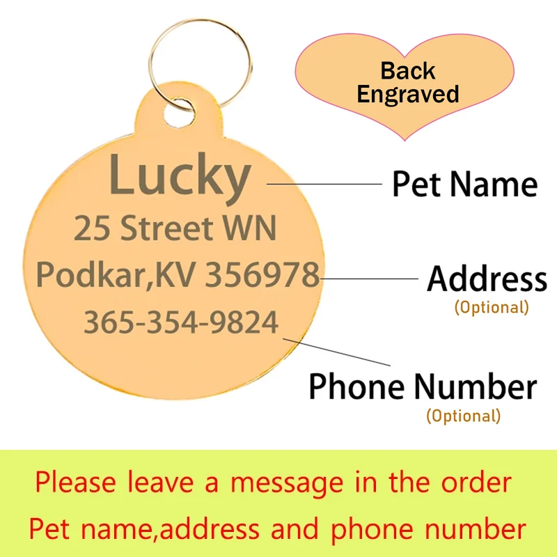 Примечание:Пожалуйста, оставьте сообщение в заказе.Или, вы можете связаться с нами, отправьте нам сообщение вашего питомца.Если мы не сможем получить ваше сообщение в течение 3 дней, мы вышлем вам пустой ярлык для собаки, надеемся на ваше понимание.