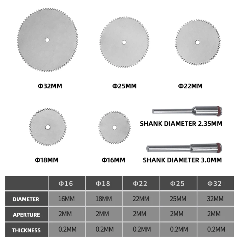 Особенности:<Мульти используется: используется на вращающихся инструментах, электроинструментах, отличный инструмент для деревообработки, резки металла и пластика.<Широкое применение: подходит для меди, алюминия, дерева, пластика и других материалов<Материал хорошего качества: Изготовлен из высококачественной нержавеющей стали, устойчив к ржавчине и коррозии, износостойкий, не легко сломать с высокой твердостью.<Хорошая производительность: острый и прочный режущий край, высокая производительность резки, отличный инструмент для резьбы/шлифовки<Легко установить: режущее колесо имеет легкий и компактный корпус, идеально подходит для резки мелких предметов, его легко установить и заменить старый или сломанный<5 лезвий: Есть 5 виды размеров на ваш выбор, 16/18/22/25/32 мм.<Совместимость: поставляется с хвостовиком режущего диска оправы подходят для большинства электрошлифовальных машин или роторных инструментов и воздушных инструментов