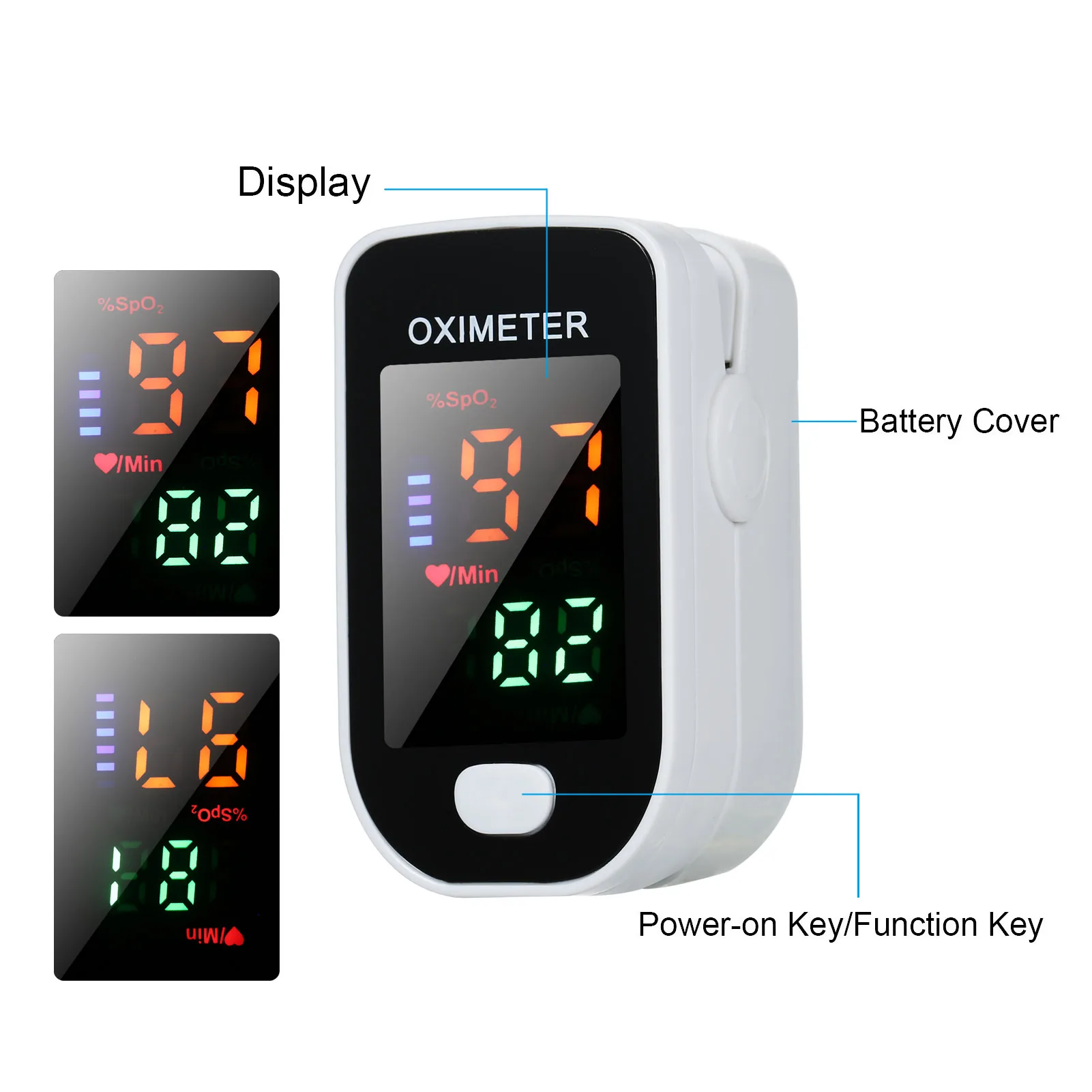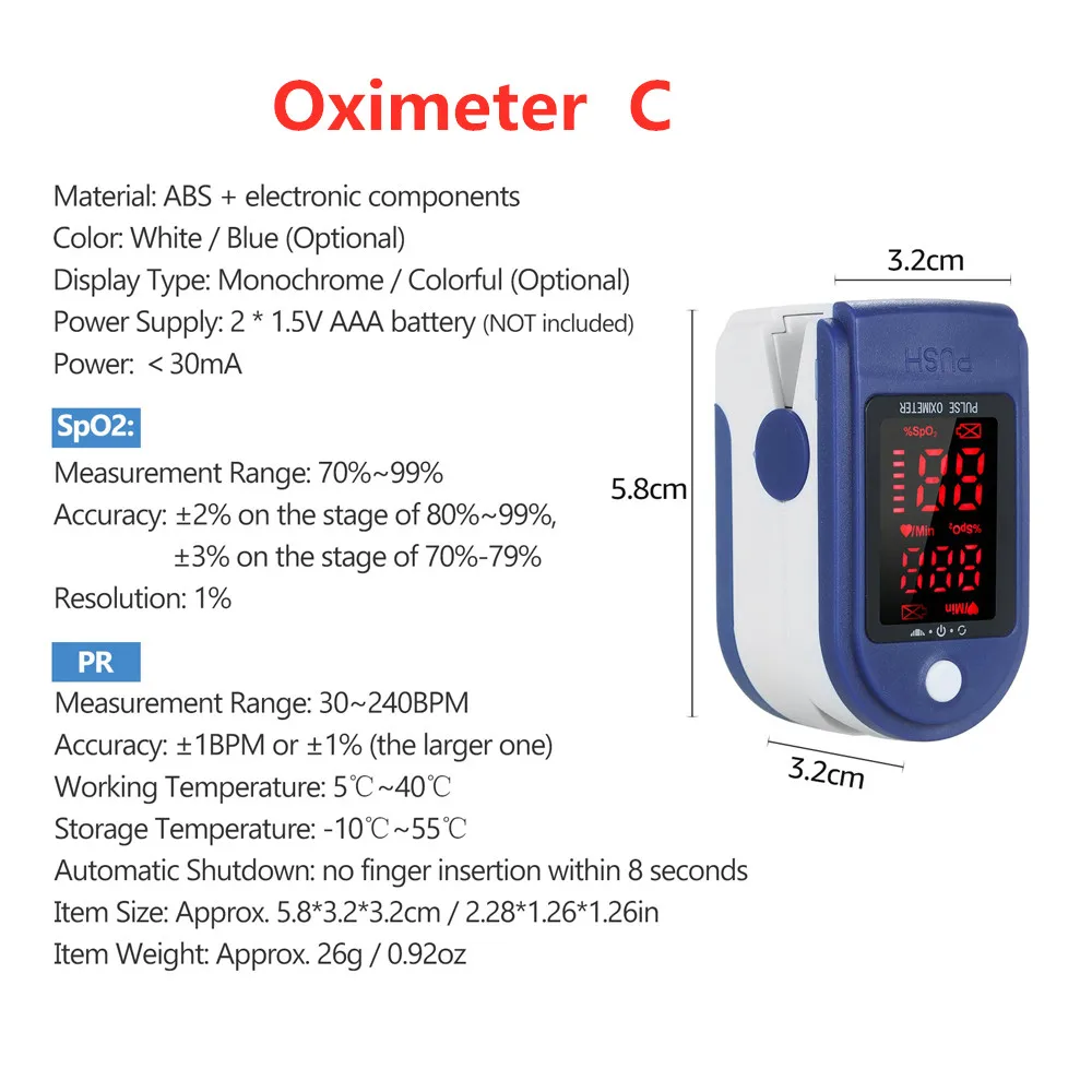 Оксиметр может использоваться для измерения насыщения кислорода, пульса через палец. Продукт подходит для семьи, личной гигиены в спорте и т. Д.