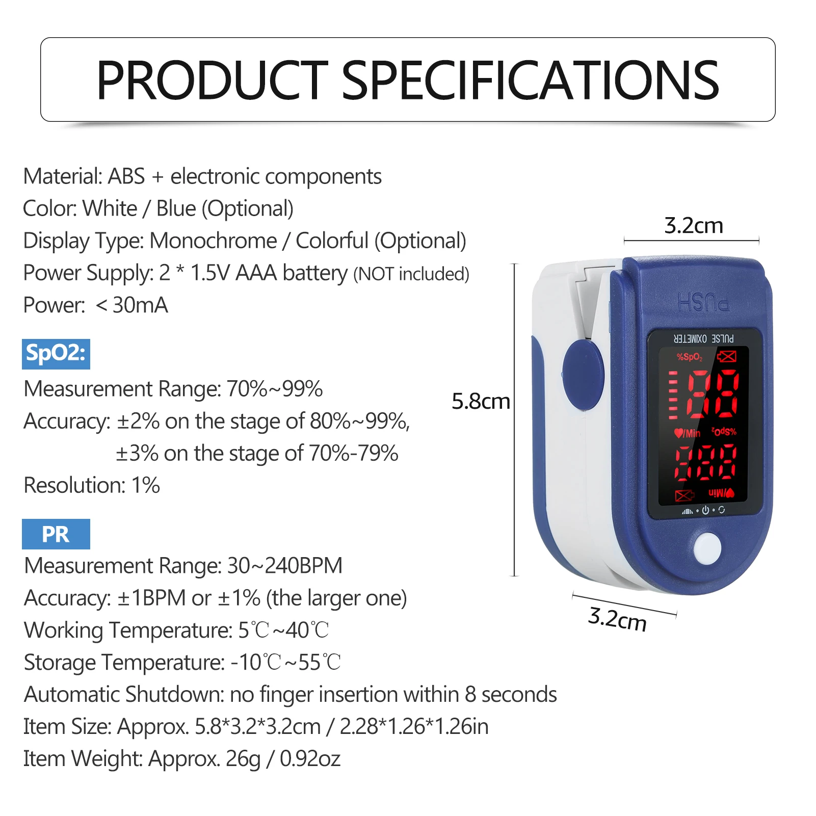 [Как использовать]: Включите пульсоксиметр, положите один из ваших пальцев в Силиконовое отверстие оксиметра. Затем отпустите зажим, нажмите кнопку, оксиметр перейдет в рабочее состояние. Оксиметр автоматически попадает в режим ожидания или сна через 8 секунд без пальца.