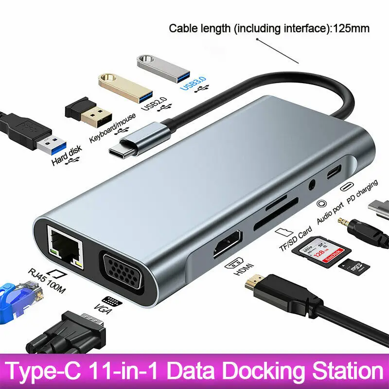 Концентратор USB3.0 UGI 11 в 1, USB Type-C, адаптер для чтения TFSD, разветвитель, HDMI-совместимый, 4k, 1080, VGA, RJ45, порт 3,5 мм, аудио, зарядка PD