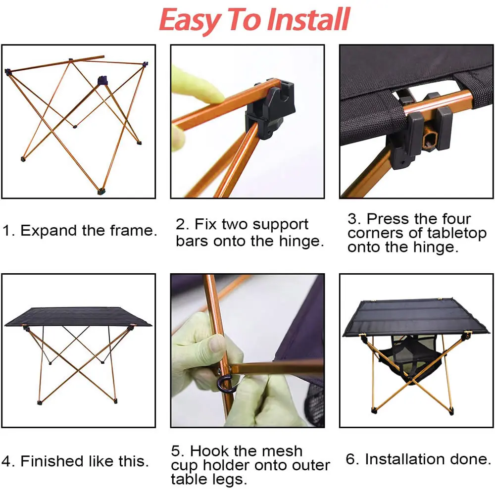 Легко настроить-никаких инструментов не требуется! Базовая рама нашего портативного внешнего стола предназначена для легкого всплывания и сложения. Уникальная конструкция шарнира обеспечивает легкое и надежное подключение к столешнице. Просто откройте его и прикрепите столешницу, и вы готовы к работе!
