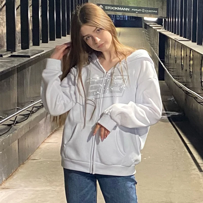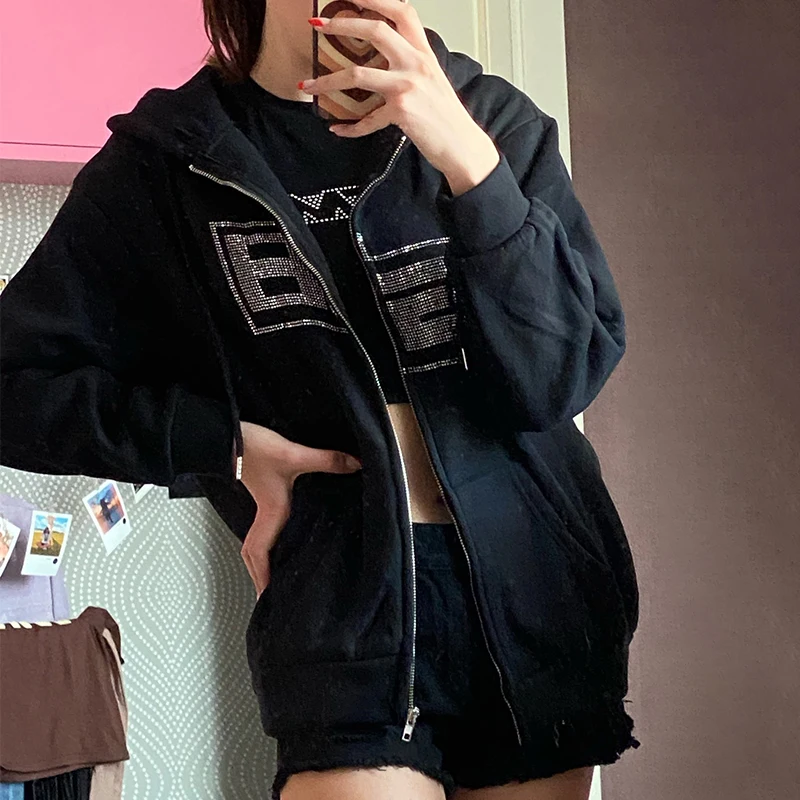 Модные толстовки E-girl Стразы с надписью на молнии Y2k, большие ра...