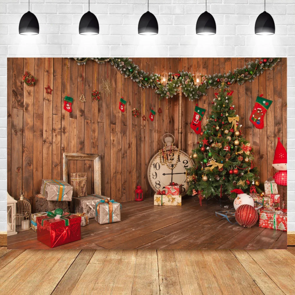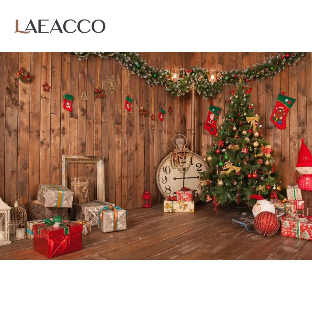 Рождественская елка Laeacco, подарки, часы, деревянная стена, Детская фотография, фотография, фон, фото-декорации