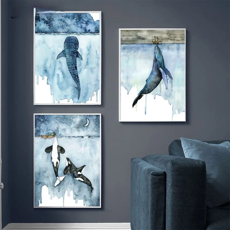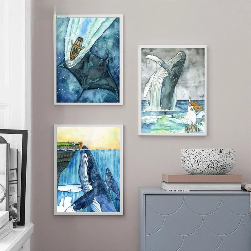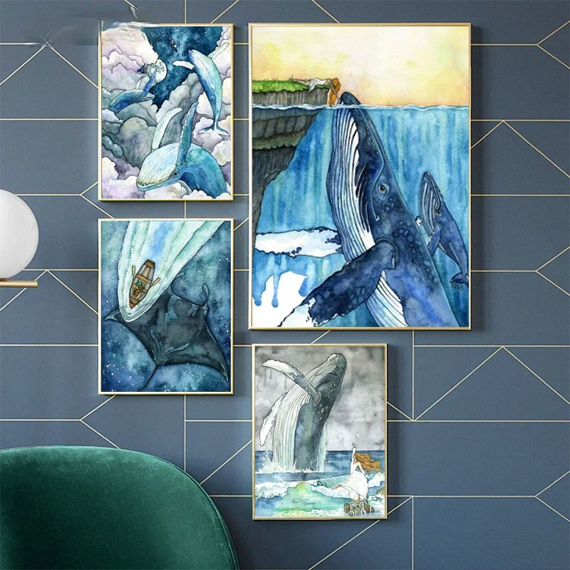 Плакаты и принты в скандинавском стиле с изображением китов, акваре...
