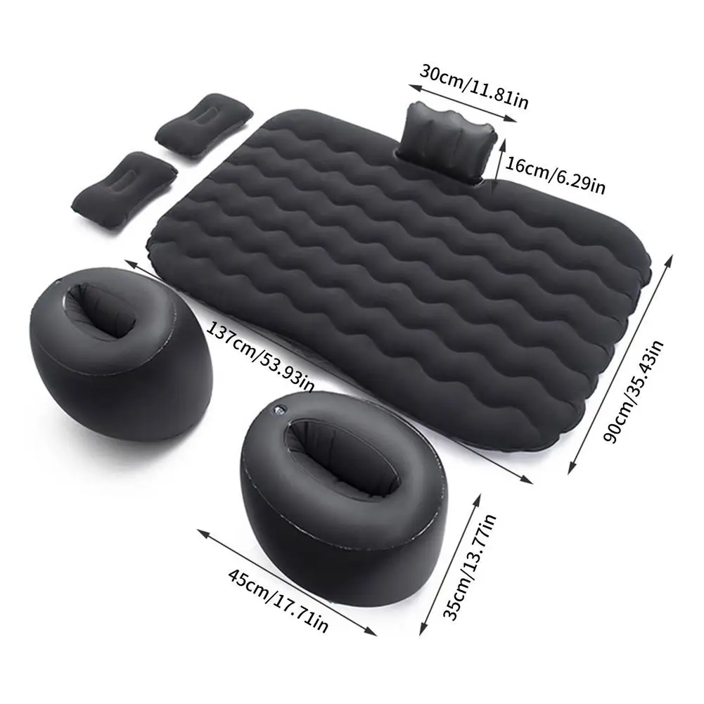 Features:Detachable Design: Special in the detachable design, you can integrate the car travel bed to enjoy a full-stretch on the backseat or pick up partial components of the car couch to enjoy a comfortable nap on the copilot seat.Fast Inflation and Deflation: A matter of minutes of inflating or deflating with the air pump, our inflatable mattress can be used or folded quickly. Pump the inflatable bed and place it on your back seat.Full Accessories: Our car mattress provides everything you need to travel. Bed with pillows mimics sleep on your bed at home. Great companion for your road trips, travel, hiking and other outdoor activities.Comfort and Safety: Conforming to ergonomics, the car air mattress better supports your spine and provides you with great comfort. Kids anti-drop and head guard design protects your kids and you from falling, without worrying about sudden turn or brake.Soft Materials: Our car travel bed is made up of premium PVC with soft flocking surface. When you feel tired you can lie down on the car air mattress comfortably and cozily to enjoy a sound sleep.Specifications:Material: PVC and flockingInflated size: about 135*80*10cm/54*32*4inPacking List:Car Air Mattress*1Air Pillows *2Pump Kit *1Storage Bag*1Repair Pad*1Foot Pier*2Note:1.Please don' t make it touch cigarette or any sharp objects.2.Please take protective measures for your first try.3.Please do not allow your children use the air car mattress without your company.4.Due to manual measurement, there will be tolerance in product size, which is subject to the actual product.