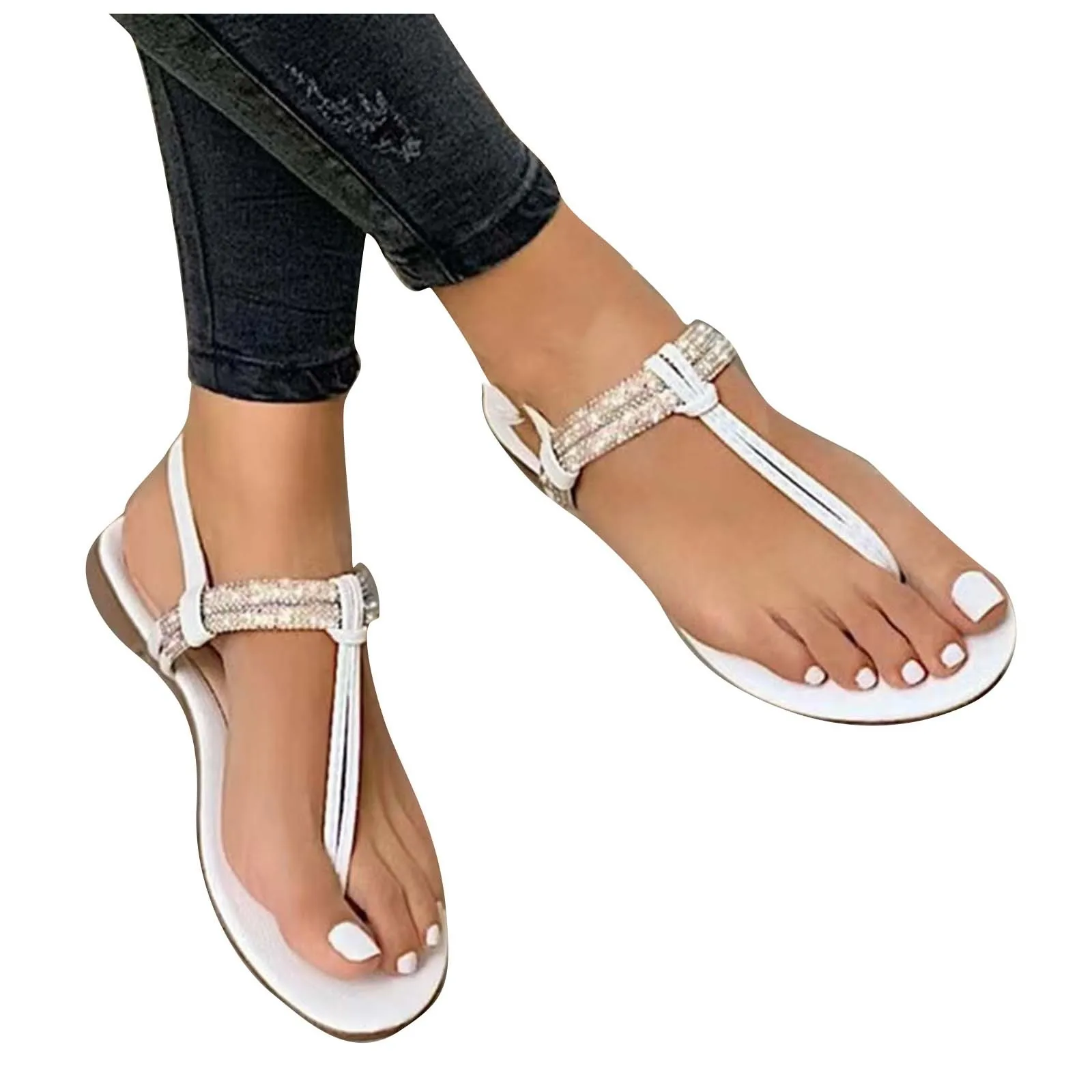 Женские сандалии стразы 2021, обувь с Т-образным ремешком, летняя женская пляжная обувь на плоской подошве, женские сандалии с ремешком и пряжкой