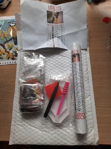 Доставка 17дней до Ленинградской обл. Упакован заказ в пакет, схема намотана на валик,стразы в зиц-пакетиках, инструменты отличные. Продавца рекомендую.