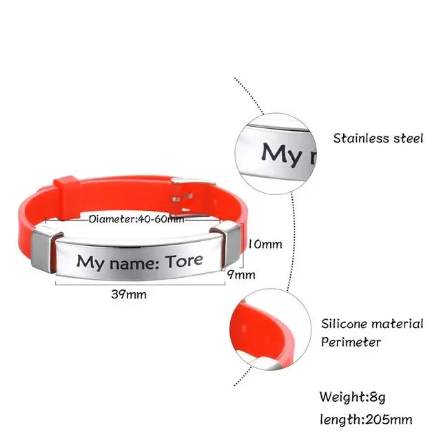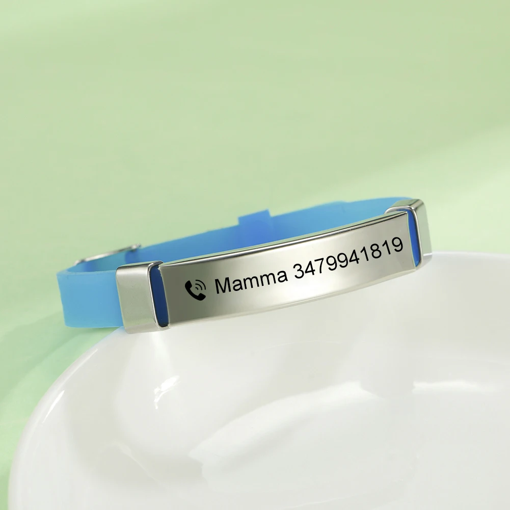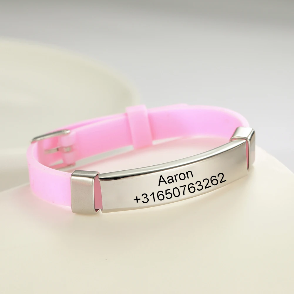 Персонализированный индивидуальный браслет для удостоверения личности для ребенка, SOS, имя ребенка, номер телефона, мягкий силиконовый руль, ювелирные изделия из нержавеющей стали