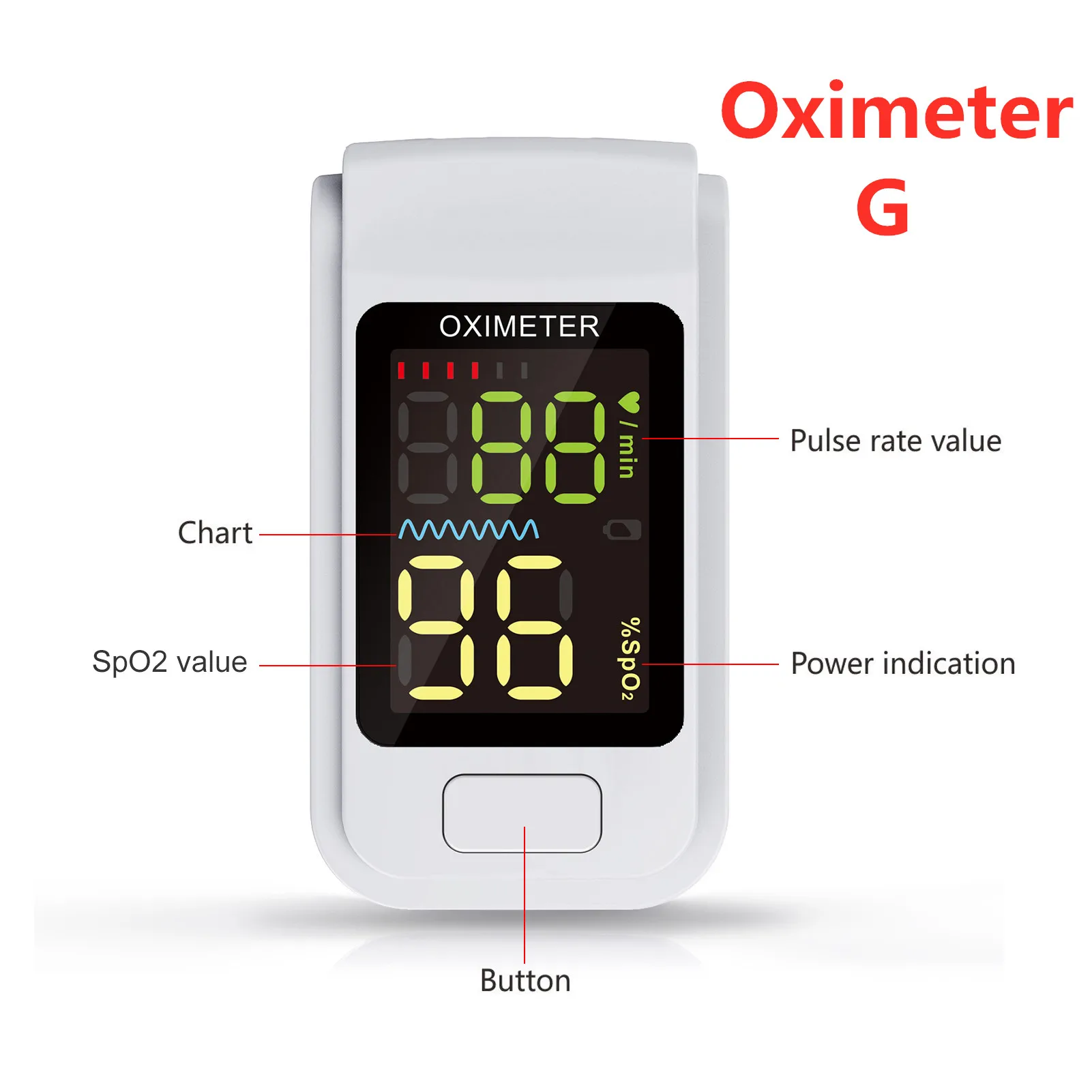 [Как использовать]: Включите пульсоксиметр, поместите один из пальцев в Силиконовое отверстие оксиметра. Затем отпустите зажим, нажмите кнопку, оксиметр перейдет в рабочее состояние. Оксиметр автоматически попадет в режим ожидания или сна через 8 секунд без пальца в нем.
