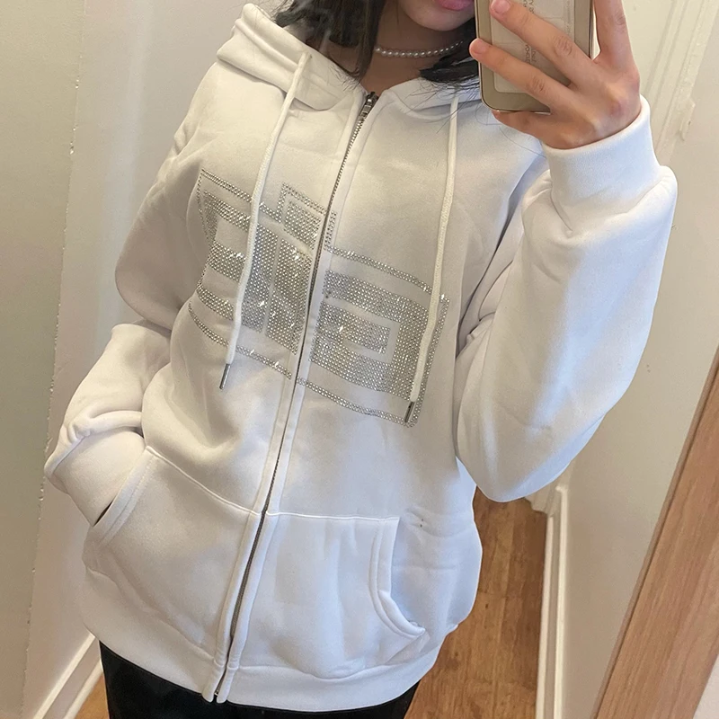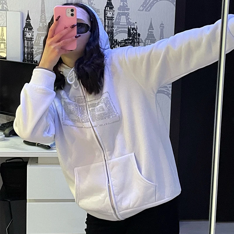 Y2K Harajuku Стразы с капюшоном на молнии в Корейском стиле свободн...