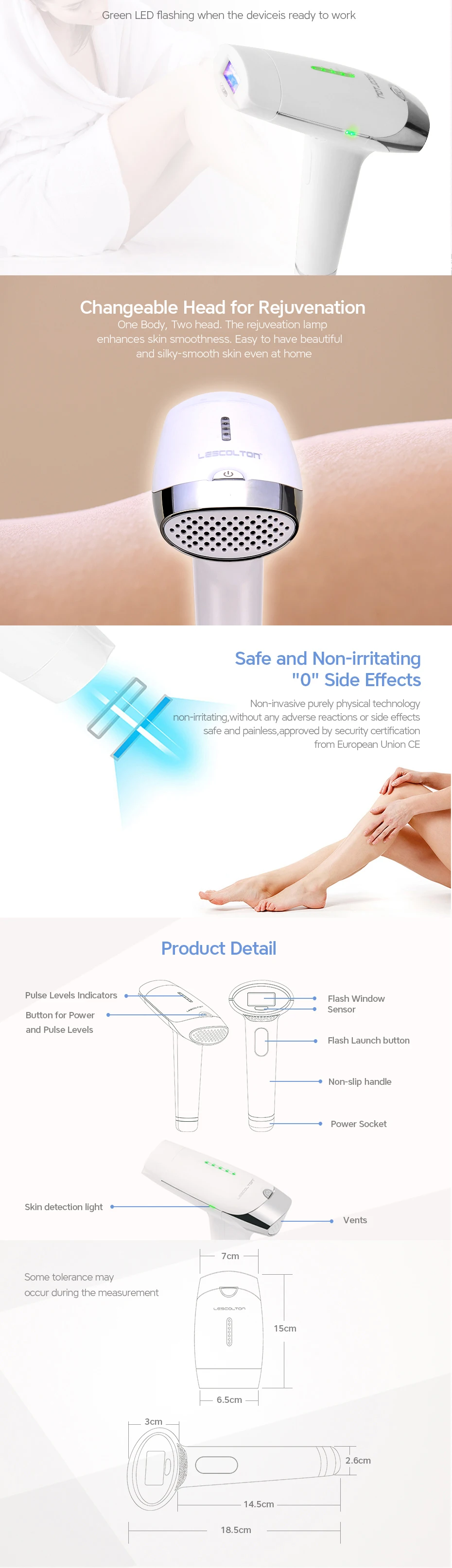 Спасибо за выбор новейшего лазерного эпилятора Lescolton IPL, лазерного эпилятора, перманентного бикини, 5 уровней, домашний электрический эпилятор a Laser. По сравнению с другими популярными моделями, в этой модели используется высокоуровневая кварцевая лампа для удаления волос, чтобы иметь гораздо больше времени вспышки