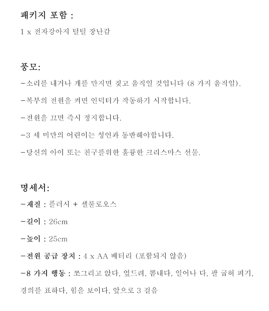 Посылка включает в себя:1 x Электронный Робот собака плюшевая игрушкаОсобенности:-Когда вы делаете звук или прикасайтесь к собаке, он будет лаять и совершать движение (8 различных движений).-При включении питания на животе индуктор начинает работать.-Выключите питание, и оно прекратится сразу.-Дети до 3 лет должны играть в сопровождении взрослых.-Отличные рождественские подарки для ваших детей или друзей.Характеристики:-Материал: плюш + целлюлозная ткань-Длина: 26 см-Высота: 25 см-Источник питания: 4 батарейки типа АА (не входят в комплект)- - 8 различных движений: спуск, подставка для рук, кокетство, стоячие, нажатие, продажа, сила дисплея, 3 шага вперед