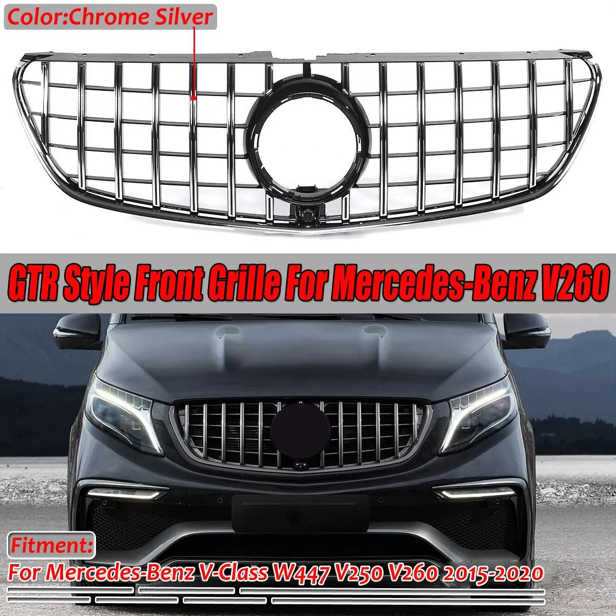 Для Mercedes для Benz V-Class W447 V250 V260 2015-2020 GTR стиль Передняя решетка для гриляПосылка включает в себя:1x GTR стиль Передняя решетка для гриля (без эмблемы)Приспособление:-Подходит только для Mercedes Benz V-Class W447 V250 V260 2015-2020-Не подойдет для моделей VITO!!Спецификация:-Тип: передняя решетка гриля в стиле GTR-Материал: высококачественный АБС-пластик-Цвет: Глянцевый черный/хром серебристый-Размещение на транспортном средстве: спереди-Тип установки: прямая заменаХарактеристика:-Изготовлен из высококачественного АБС-пластика.-100% защита от погодных условий, никогда не выцветает.-Идеальная установка без каких-либо изменений.-Отличное качество и отличная посадка.-Правильный разъем без резки или сращивания.-Строгие стандарты контроля качества для сборки и тестирования.-Пожалуйста, внимательно проверьте фитинг перед покупкой.-Инструкции по установке не включены, Профессиональная установка настоятельно рекомендуется!Примечание:-Пожалуйста, учитывайте разницу в 1-3 см из-за ручного измерения.-Из-за различных дисплеев и другого светильник, изображение может не отражать фактический цвет товара. Спасибо за понимание.