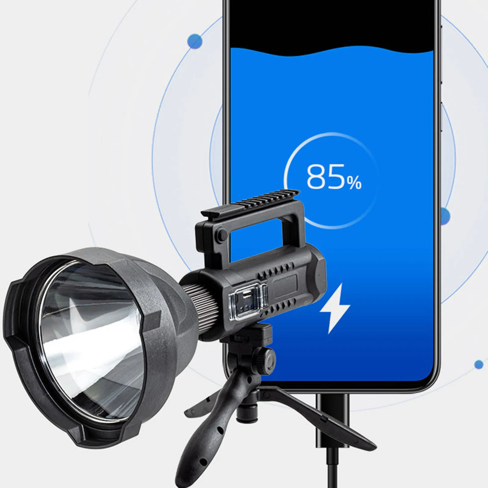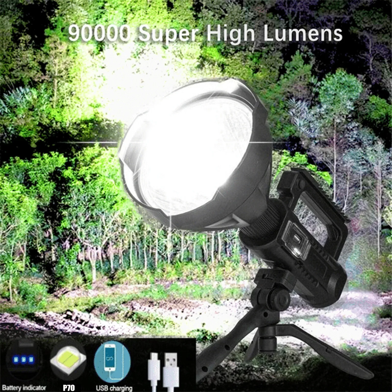 Супер яркие фары, большое расстояние освещения, большое расстояние, Поворотный и съемный. Легко носить с собой и может быть оснащен штативом, который очень подходит для активного отдыха в качестве прожектора, например, пеших прогулок, кемпинга, охоты, приключений, ночной рыбалки и т. д.