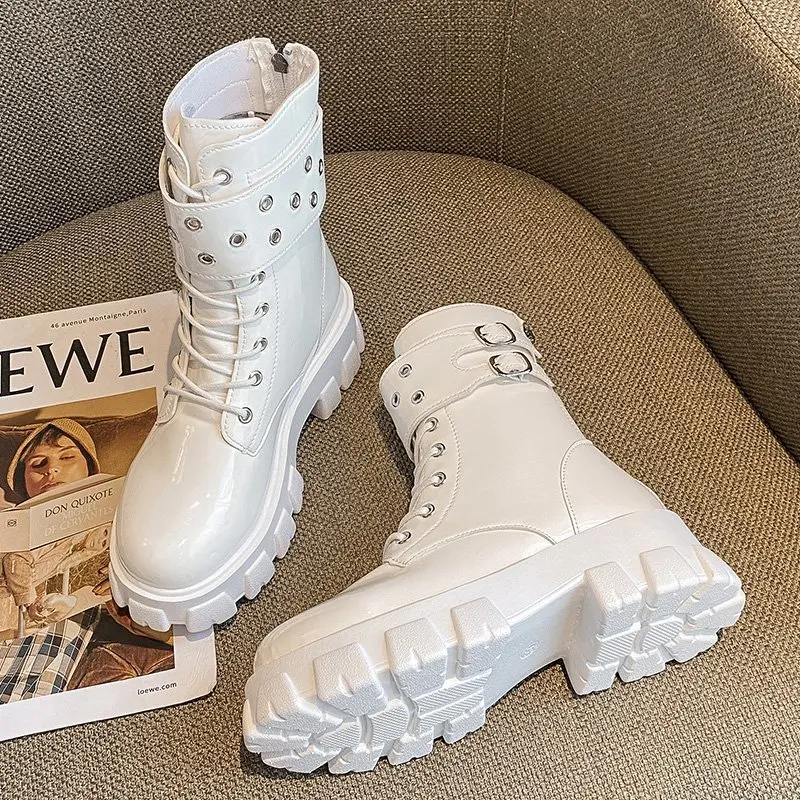 Женские ботинки на платформе, мотоциклетные, готические, массивные, черные, с металлической пряжкой, на шнуровке