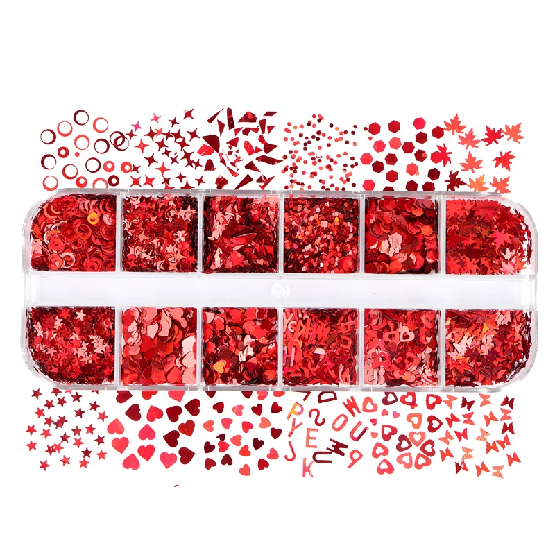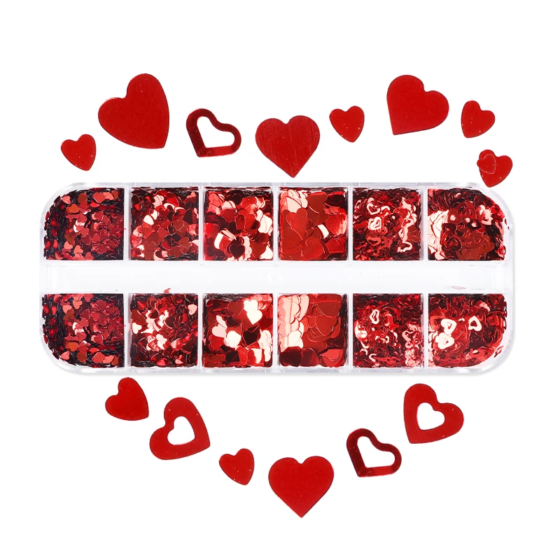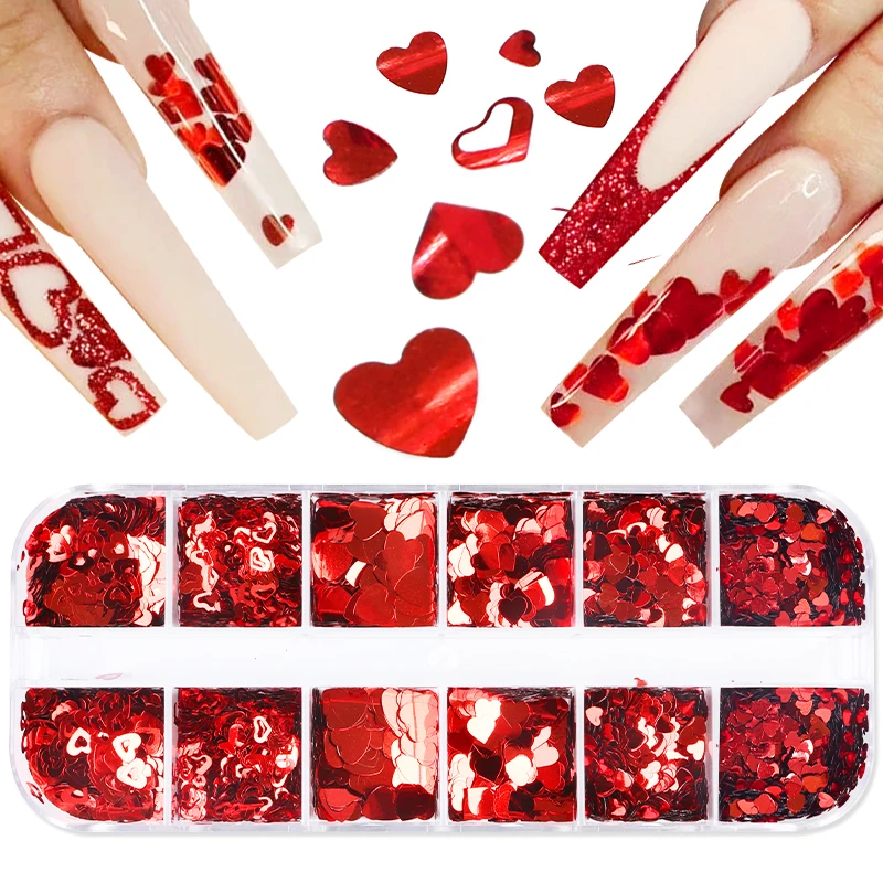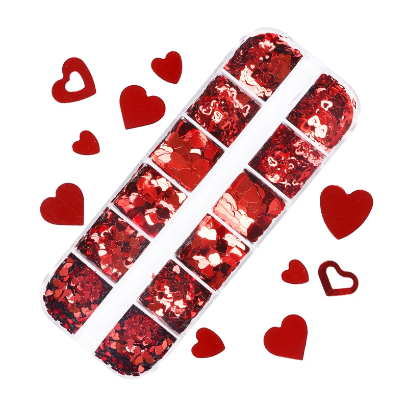 12 сеток День Святого Валентина Блестки для ногтей блестящие смешанные красные Любовь Сердце блестящие хлопья украшения для ногтей аксессуары