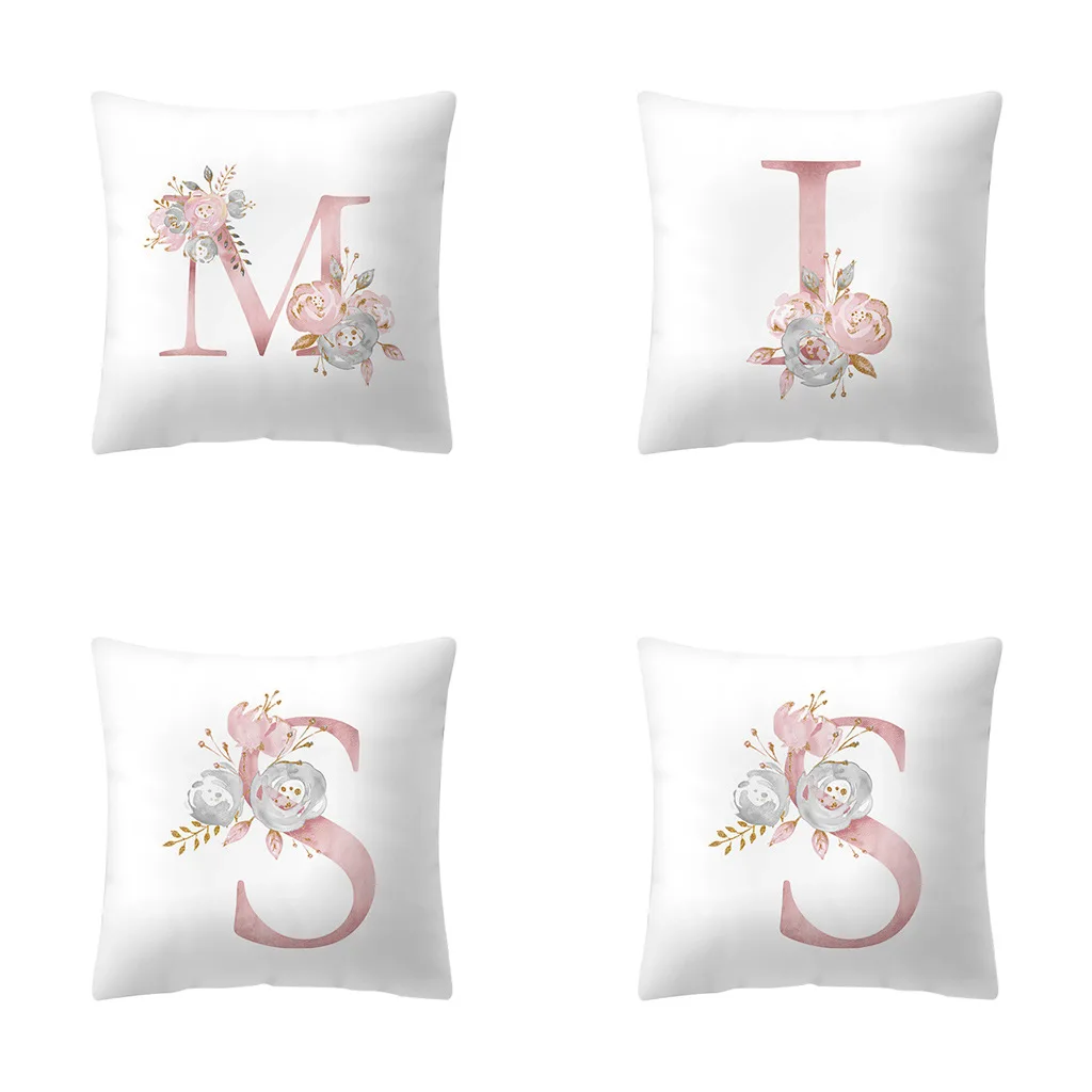 Розовая декоративная наволочка с буквами и цветочным рисунком