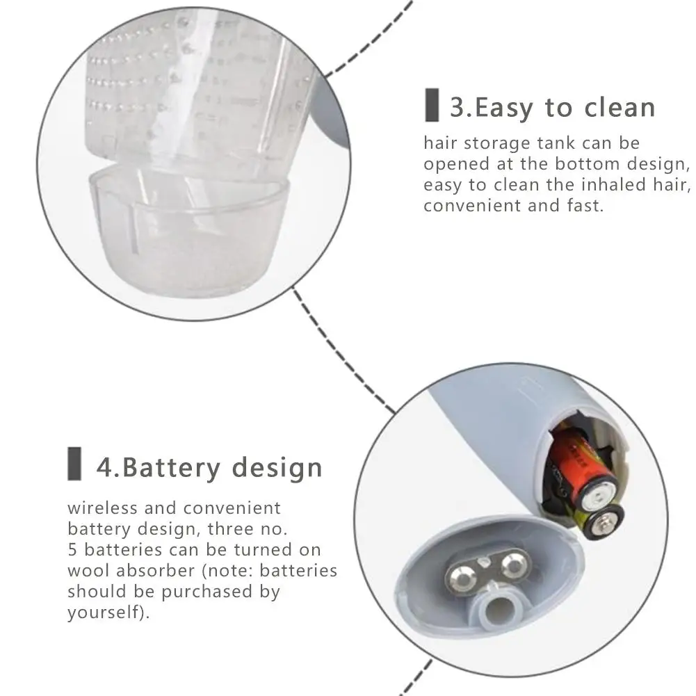 Мягкая резиновая головка также может массировать питомца во время чистки волос питомца.Низкий уровень шума: это не вредит вашему питомцу и не заставит его чувствовать себя в панике.Также может использоваться для поглощения ковра.Удобный и портативный.Параметры:Материал: АБС-пластик и Резина (нетоксичный, безвкусный, прочный)Цвет: как показано на фотографияхРазмеры: около 6 см x 11 см x 19 см/2,36*4,33 * 7.48inМощность: 220V до 3,5 V или • Питание: 3 батарейки AA (комплект не включает в себя батареи)Подходит для: собак, кошек и других домашних животных (не подходит для маленьких домашних животных, таких как хомяки)Упаковочный лист: