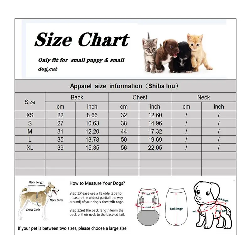 Материал: хлопокРазмер Бюст спина длиннаяXS 32 см/12,6 дюйма 22 см/8,66 дюймаS 38 см/14,96 дюйма 27 см/10,63 дюймаM 44 см/17,32 дюйма 31 см/12,2 дюймаL 50 см/19,69 дюйма 35 см/13,78 дюймаXL 56 см/22,05 дюйма 39 см/15,35 дюймаХарактеристики продукта1. Гибкая ткань, дышащая, мягкая, теплая, нелегко начать, очень удобная2. Верхняя одежда из полиэстера, мягкая и удобная, теплая, не падает, износостойкая к укусу3. Трехмерная Обрезка подходит для кошек и собак, что делает домашних животных более облегающимиПосылка:1 х Одежда для домашних животныхПримечания:1. Возможны отклонения в 1-3 см из-за ручного измерения и 3-5 г из-за разницы между цветами.2. Из-за разницы в мониторах цвет может немного отличаться от ожидаемого, пожалуйста, учитывайте это.3. 1,00 см = 0,39 дюйма
