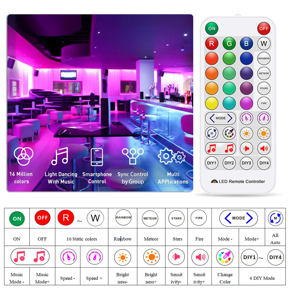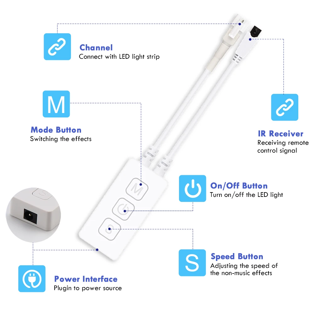 5. Встроенный 180 видов динамических эффектов, регулируемая скорость, яркость, автоматическая петля, встроенный 8 музыкальных режимов, регулируемая чувствительность;
