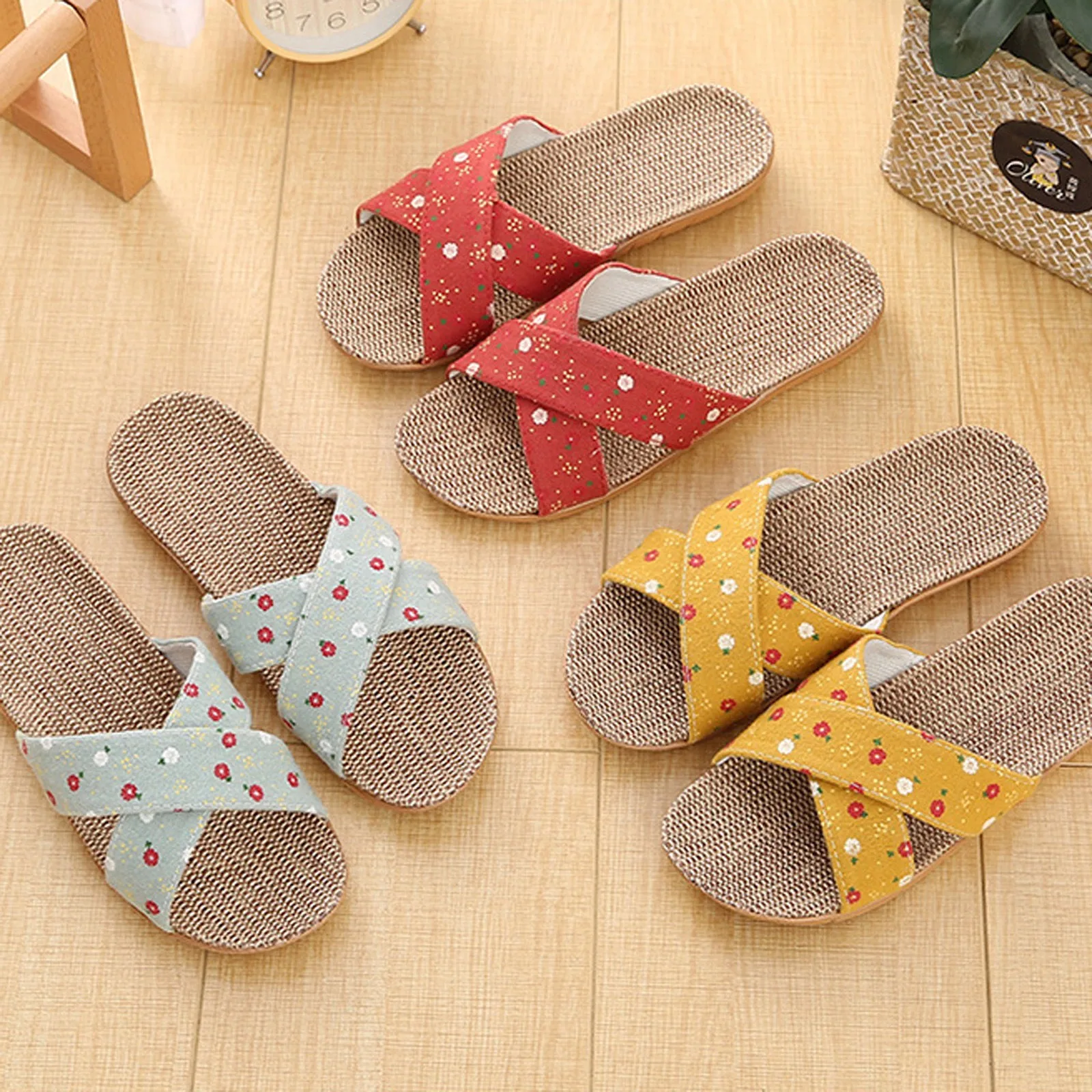 Сандалии женские на шнуровке, удобные босоножки с закрытым носком, без застежки, цветочный принт, лен, открытый носок, дышащие тапочки для улицы