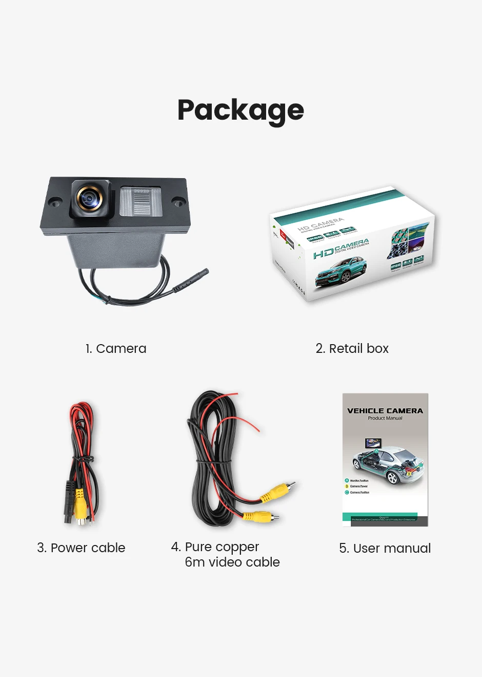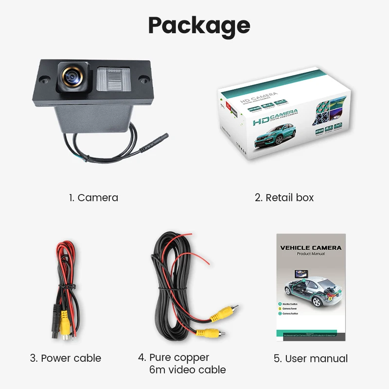 1. Камера заднего вида2. Розничная коробка3. Кабель питания4. Чистый медный 6 м видео кабель5. Руководство пользователя
