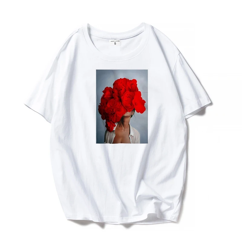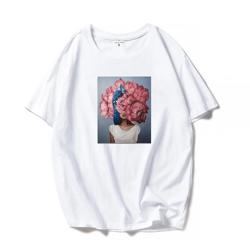 Футболка женская оверсайз с цветочным принтом, милый топ с круглым ...