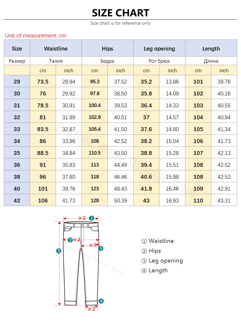 Единица измерения: см1. Размер-китайский размер, размер брюк 32 = 32 дюйма, талия = 81,5 см, талия.Пожалуйста, сообщите нам свой рост и вес, и мы предложим вам подходящий размер.2. Данные измеряются вручную, возможна погрешность в 1-3 см, пожалуйста, поймите.3. Из-за различий в освещении и различных разрешениях монитора, могут быть вызваны небольшие хроматические аберрации. Пожалуйста, ознакомьтесь с фактическим цветом полученного товара.4. Рекомендации по размерам приведены только для справки. Пожалуйста, ознакомьтесь с окончательным размером, основываясь на ваших личных привычках к одежде и измерениях в таблице размеров.
