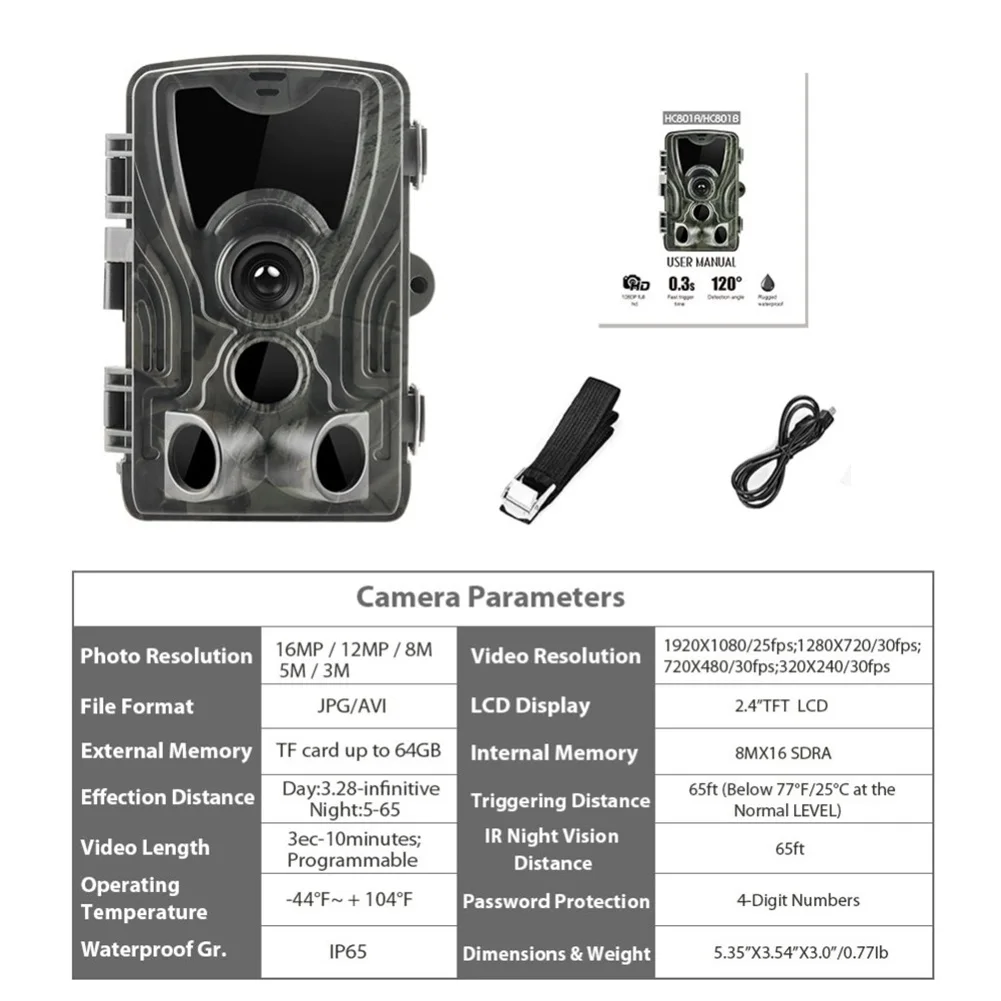 Охотничья фотоловушка HC 801A, инфракрасная камера ночного видения, фотоловушка 16 МП 1080P, камера для дикой природы IP65, камера 0,3 с, время триггера