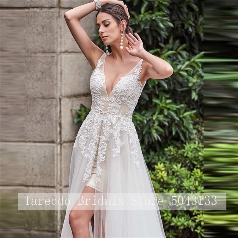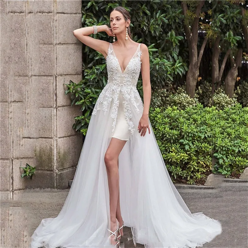 Пляжное свадебное платье с V-образным вырезом и открытой спиной, шикарные Короткие свадебные платья спереди и с длинной спиной, Дешевые вечерние наряды для выпускного вечера, 2021