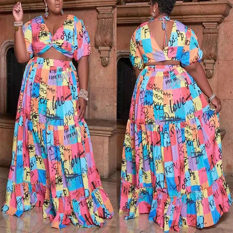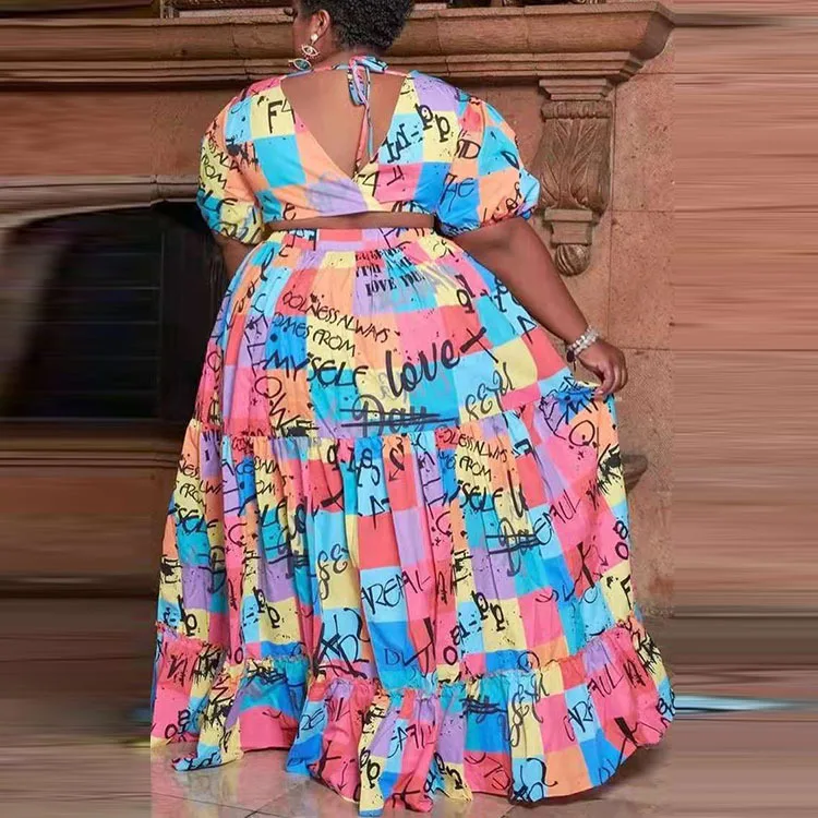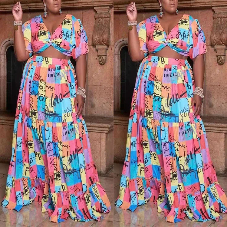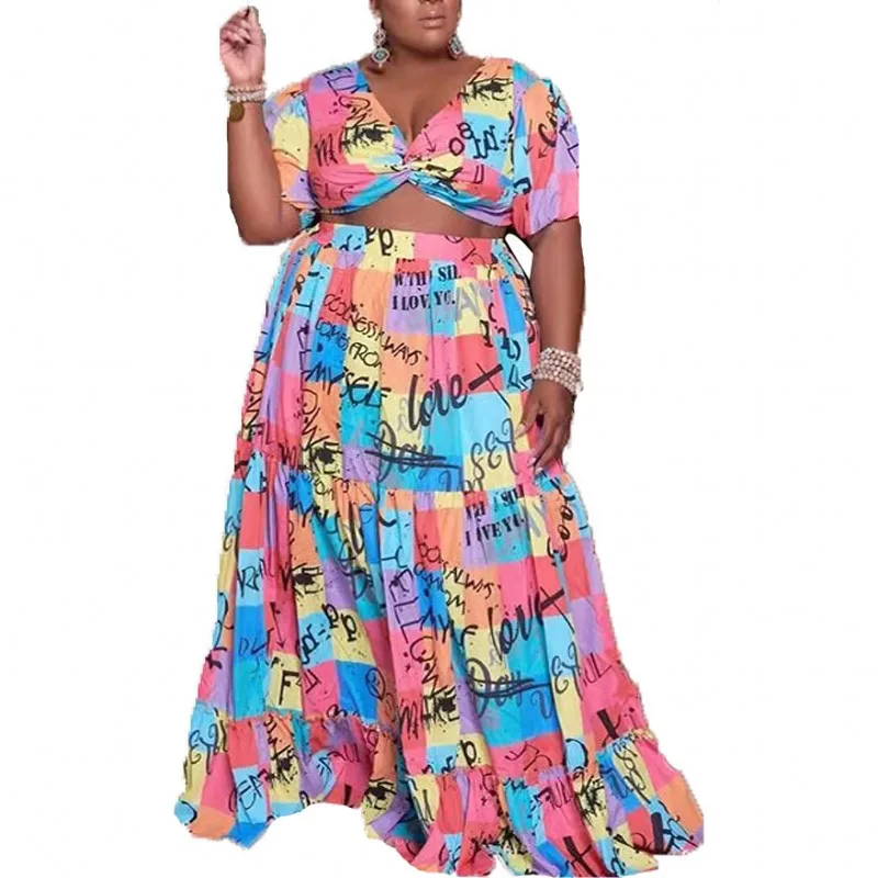 5XL размера плюс, длинные юбки, наборы, женская футболка с v-образным вырезом, укороченный топ, наряды, летняя уличная юбка с оборками и принтом граффити, костюм из 2 предметов