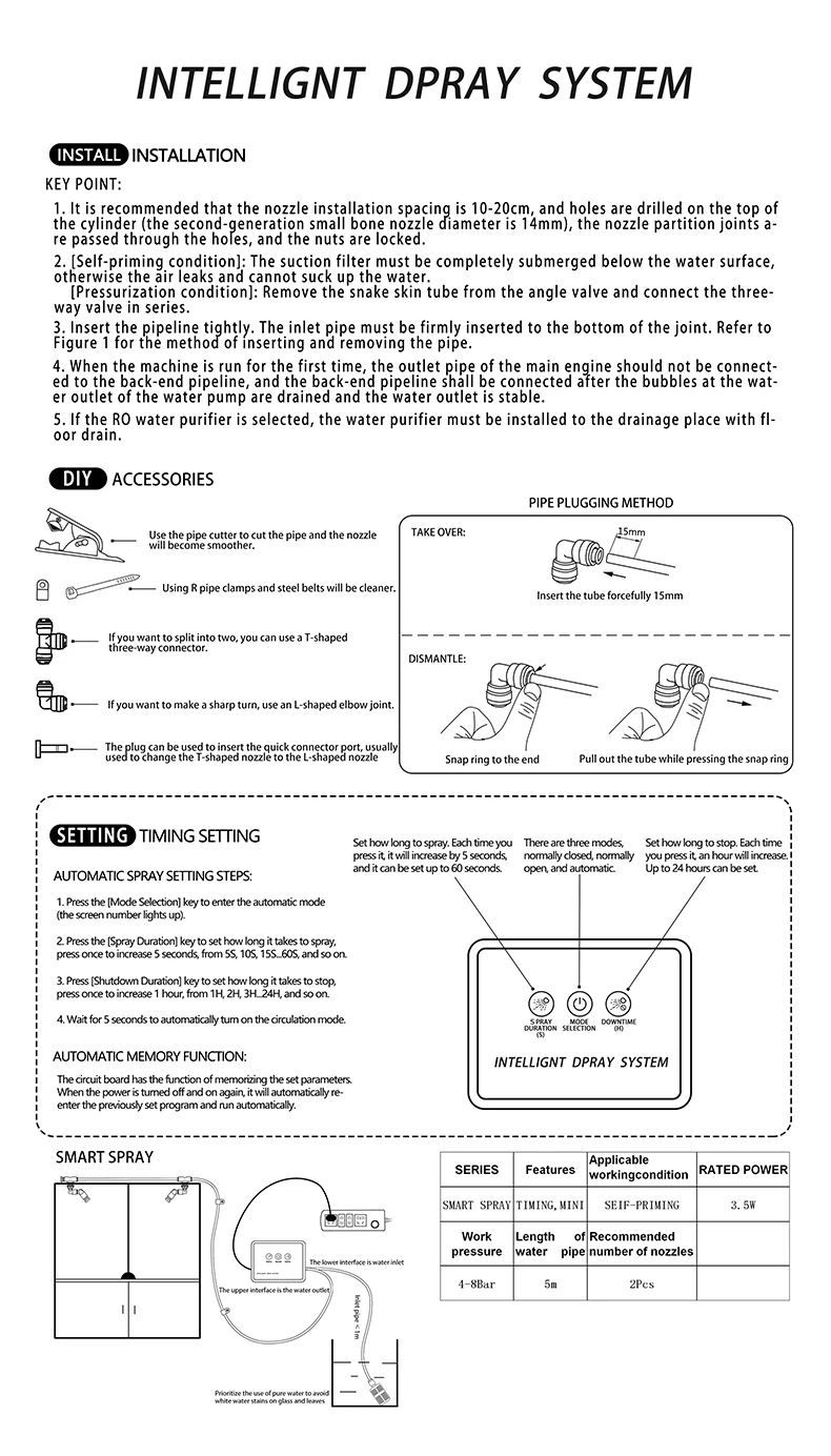 1. При тестировании продукта, пожалуйста, не проводите тест в месте с сильным сигналом, это будет мешать. Если ключи не работают, пожалуйста, проверьте в другом месте. 2. При резке водопроводной трубы старайтесь сделать срез гладким и прочно вставлять отверстия на входе и выходе, чтобы предотвратить утечку воды. 3. Пожалуйста, подключите водопроводную трубу перед запуском, воздух не может быть удален при холостом ходу.