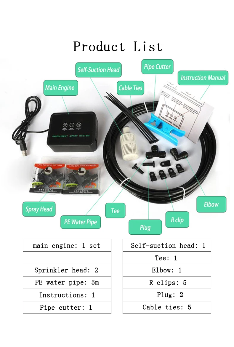 1 хост 1 х самовсасывающая головка 1 х Головка питания 1 футболка 2 x распылительная головка 1 х локоть 1 х 5 м PE водопровод 5 x r-clip 1 x Инструкция 2 х штепсельная вилка 1 х резак для труб 5 x галстук