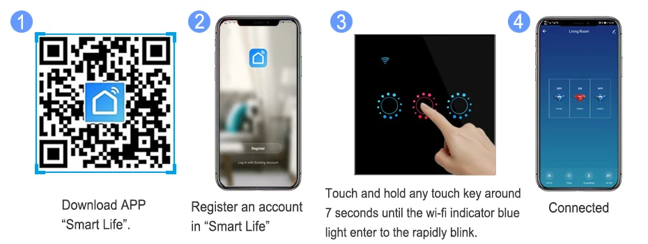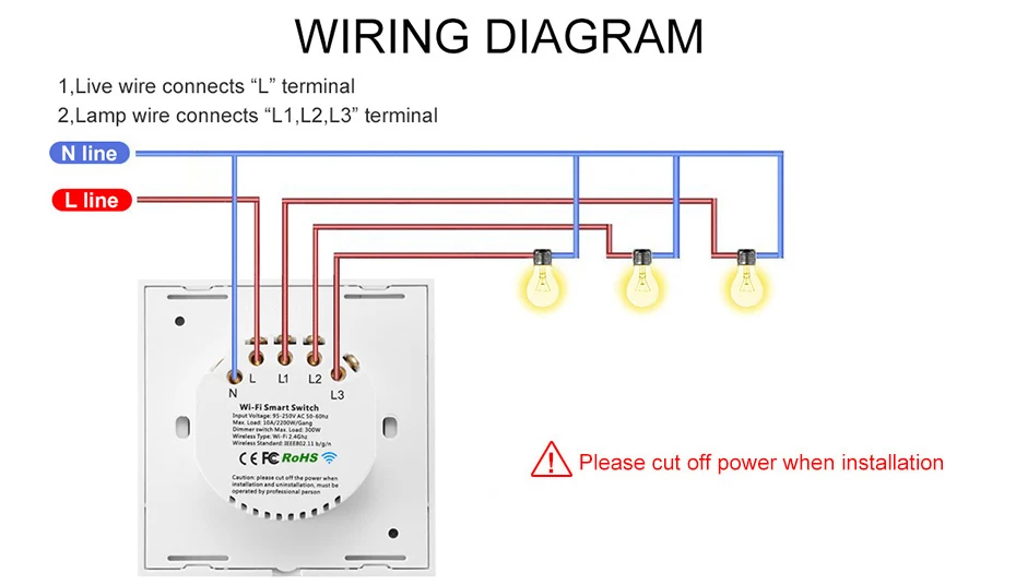 Этот смарт-переключатель Wi-Fi должен быть powerd как с помощью живой, так и с нейтральной линии, пожалуйста, отключите питание при установке и отказе от установки, работает профессиональным человеком.