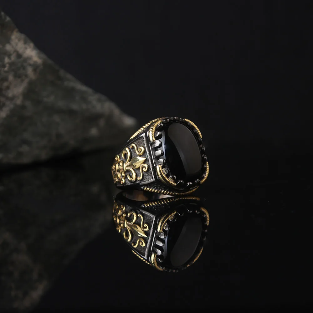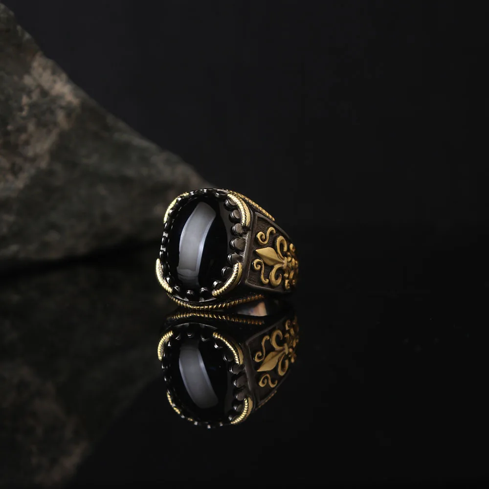 Кольцо ручной работы из серебра 925 пробы с черным Цирконом и выгравированным золотом
