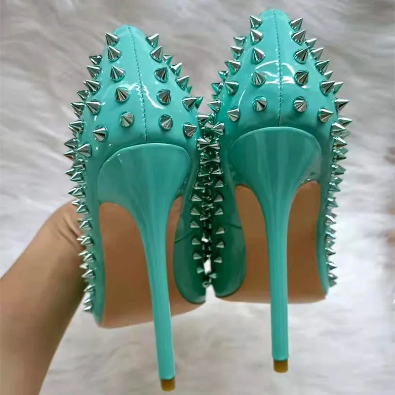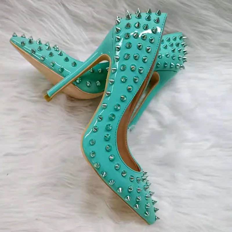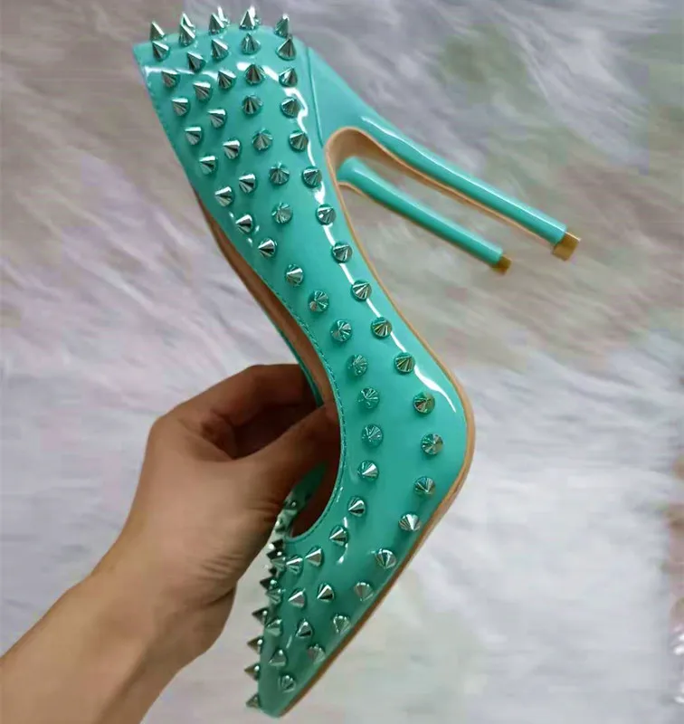 Женские блестящие туфли-лодочки с острым носком и серебряными шипами, Размеры 33 43 44 45