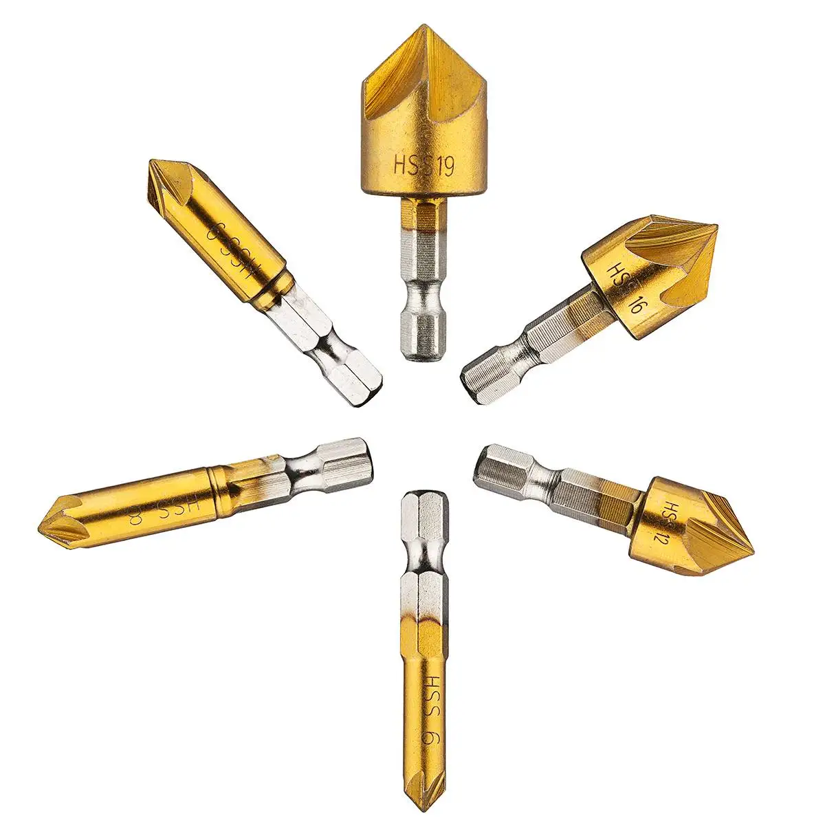 6 шт. 5 флейт зенковки набор сверл 90 ° счетчик раковины фаски Резак 1/4 "шестигранный хвостовик 6 мм-19 мм