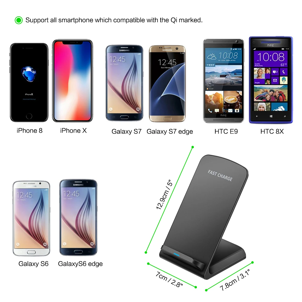 Поддержка всех смартфонов, совместимых с маркировкой Qi. Встроенный беспроводной зарядный приемник для iPhone 8/8 plus/X, Galaxy S6/S7/S8, GalaxyS6 S7 edge,S6 edge +, S8 +,Note 5/7,LGD1, lumia 820/830/920/930/1020/1050/1520,LG G2/G3/G10,Nexus 4/5/6 и т. Д.