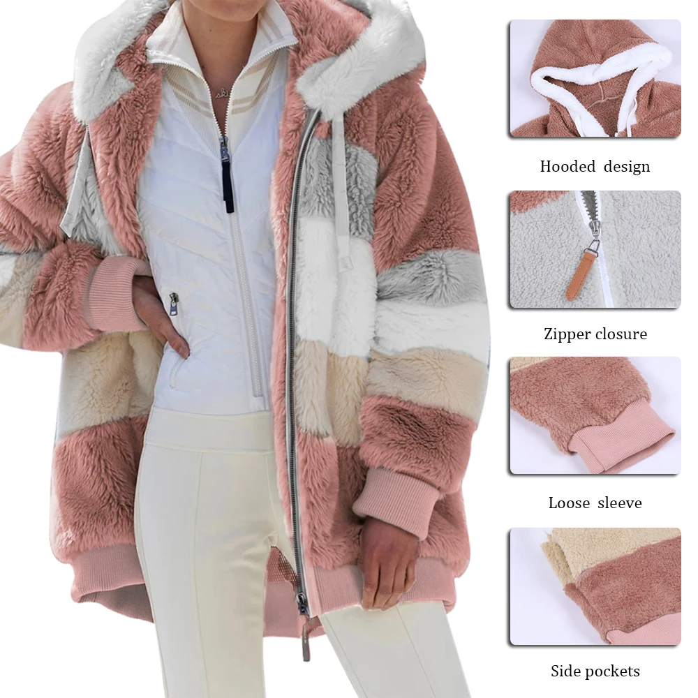 Зимняя женская куртка, модная плюшевая Лоскутная зимняя куртка с капюшоном и карманами на молнии в стиле ретро, свободная женская верхняя одежда с длинным рукавом