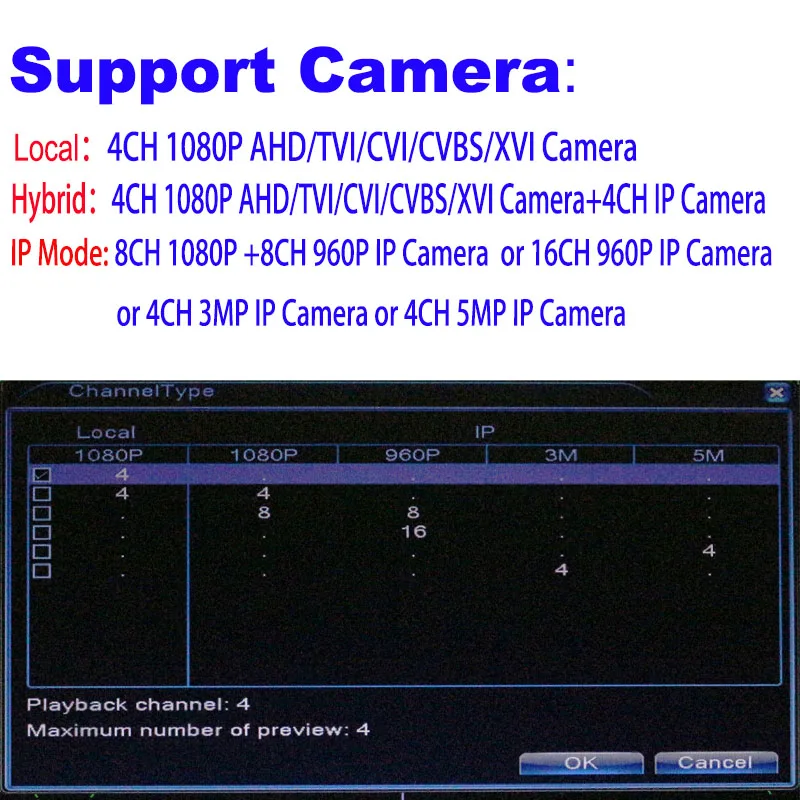 IP:8*1080P + 8*960P; 16*960P; 4*3 м; 4*5 м