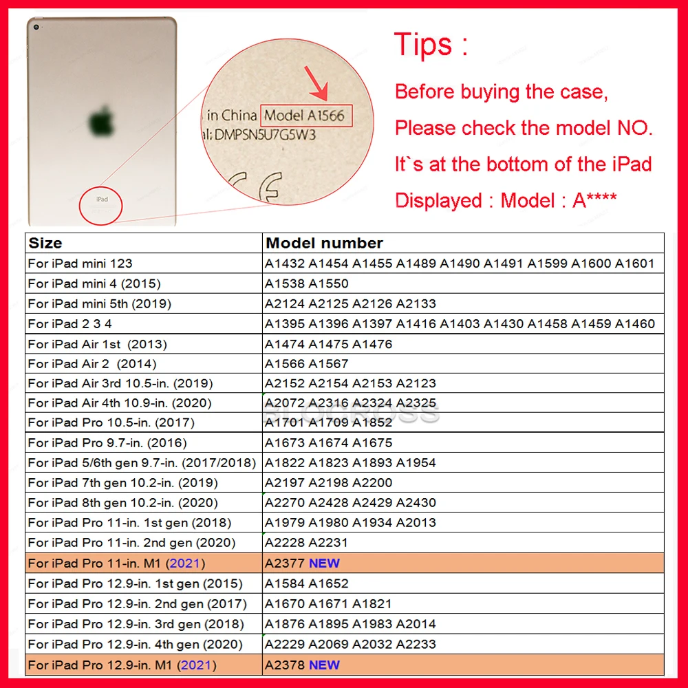 Model NumberFor iPad Pro 11 2021 Air 4 3 10.5 7th 10.2 Mini 5 2019