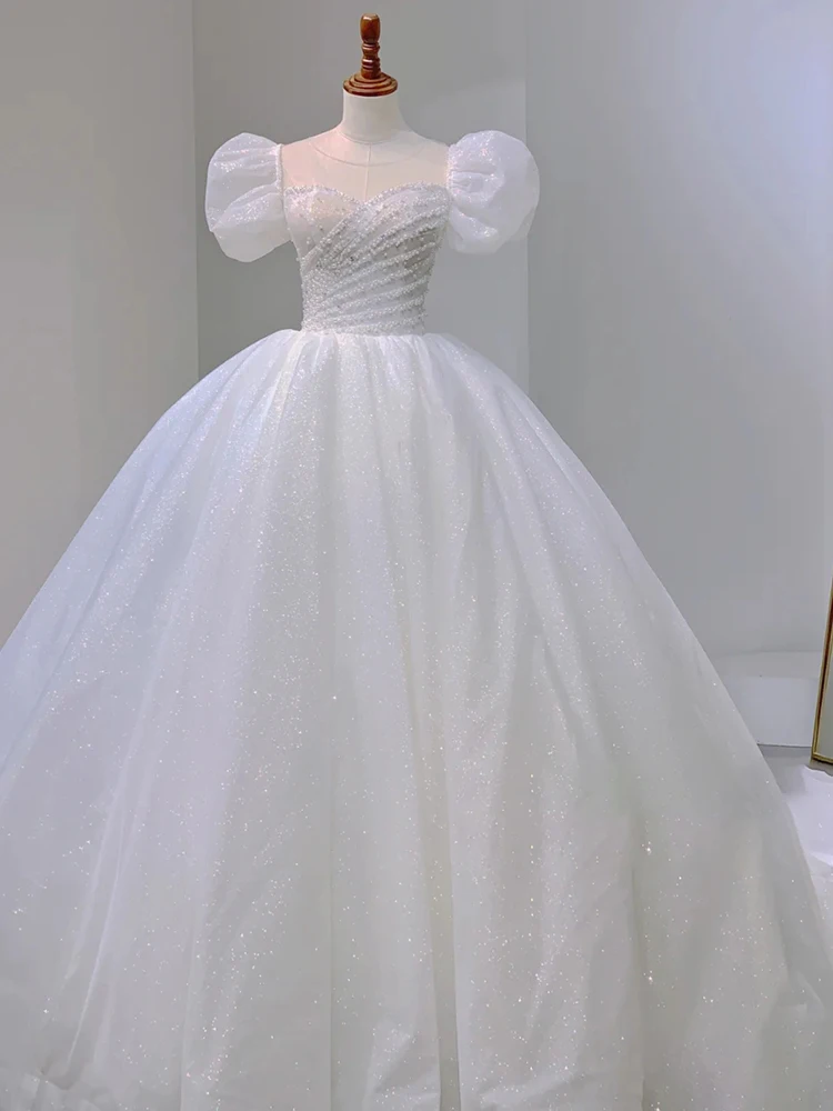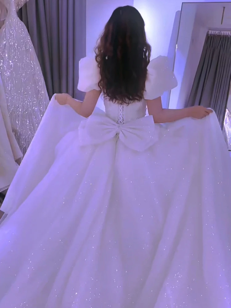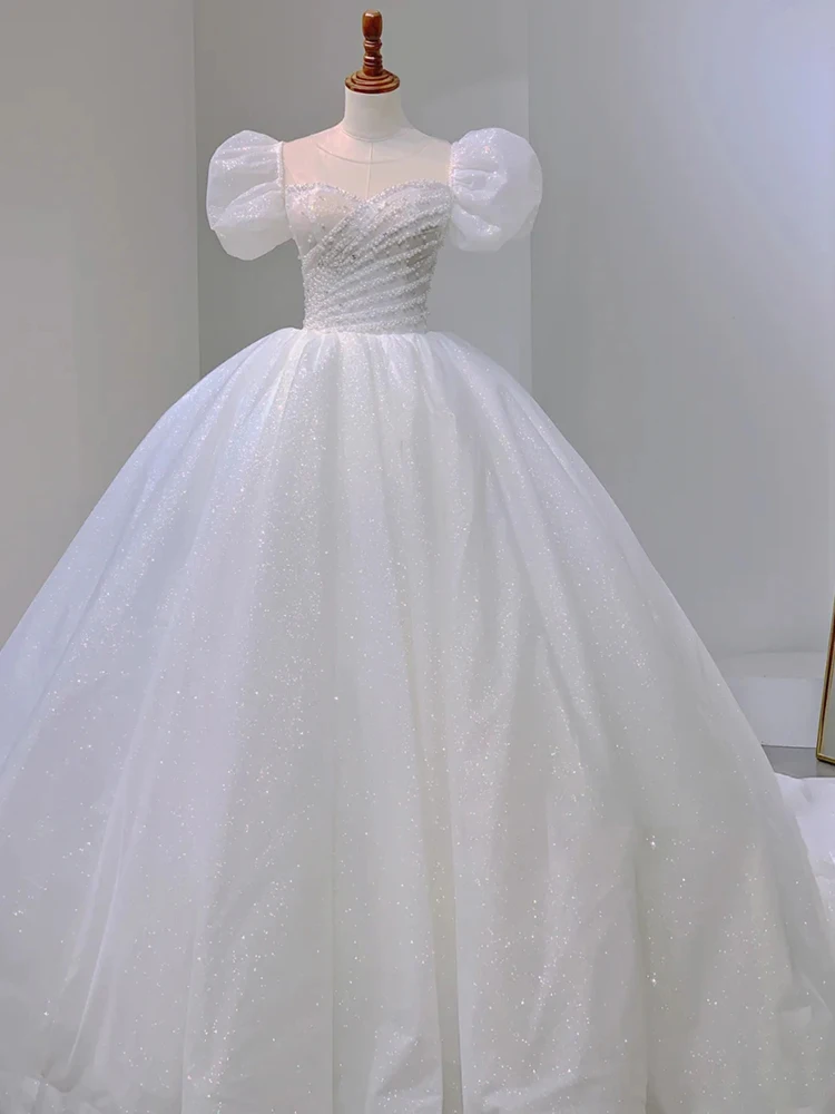 Роскошное белое искусственное свадебное платье с жемчугом 2021, Длинные свадебные платья принцессы с короткими пышными рукавами и бантом на спине