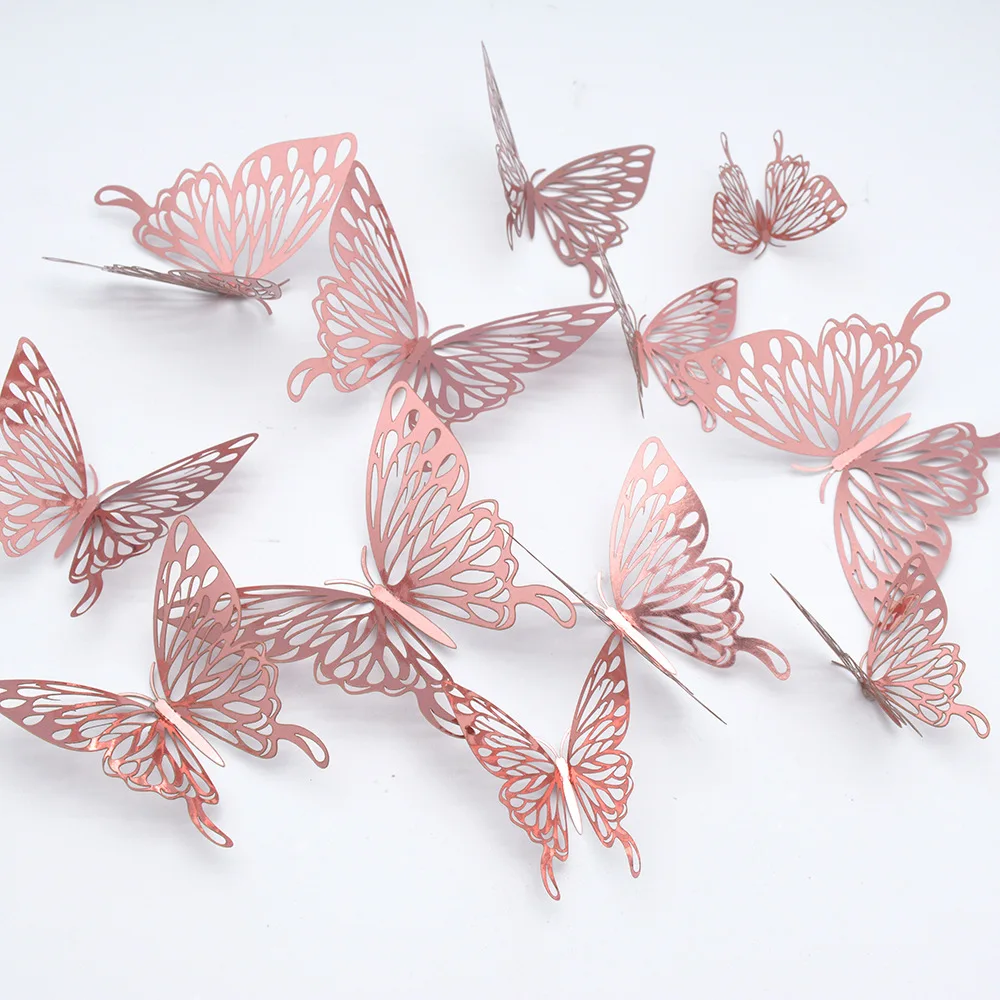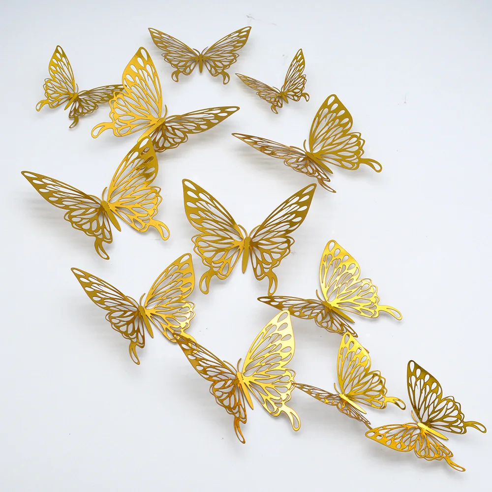 12 шт. 3D наклейки на стену полые розовые Золотыесеребряные бабочки...