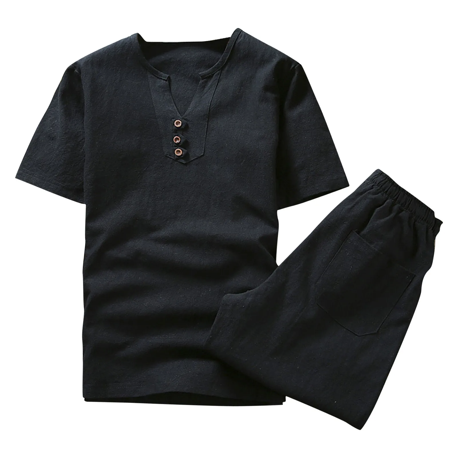 Мужской комплект из хлопка и льна, Однотонная футболка с коротким рукавом, повседневный комплект большого размера